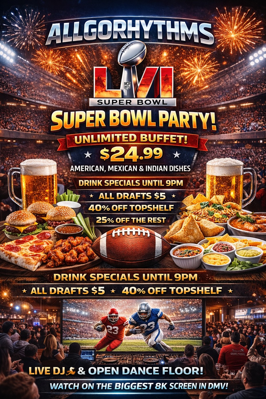 🏈 SUPER BOWL SUNDAY at ALLGORHYTHMS 🎉 Where the game, food & party vibes all collide!